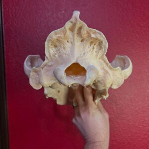 The skull measures 15¼ inches (38.7 cm) in length and 9 inches (22.9 cm) in width, highlighting its exceptional scale. While one molar and a few small teeth are missing, the skull remains structurally sound and visually striking, with excellent bone integrity and well-defined anatomical features. These minor absences do not detract from its display or educational value.