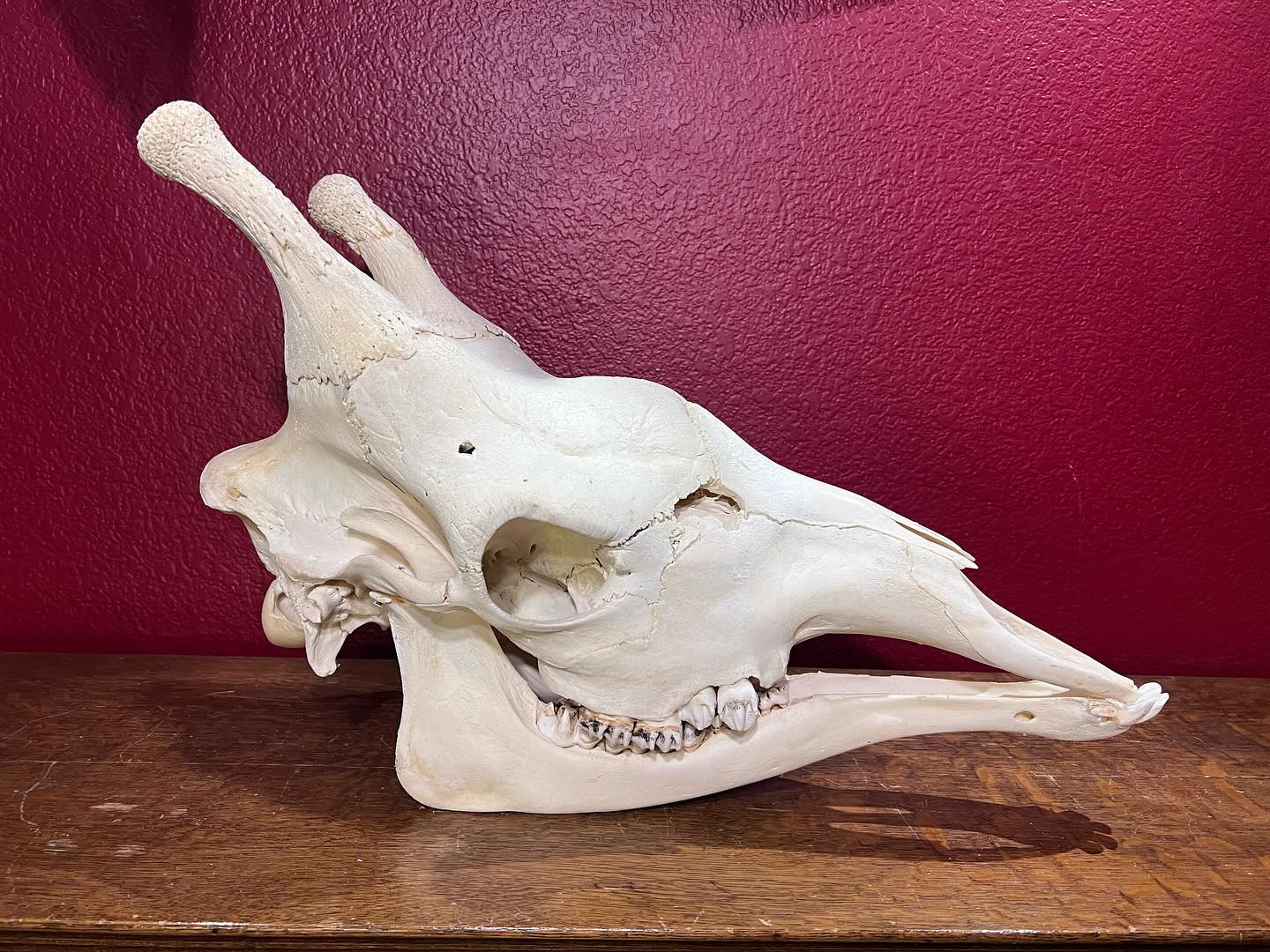 The skull measures approximately 28 inches in length, 11 inches in width, and 13 inches in height, reflecting the distinctive elongated proportions characteristic of the species. Importantly, the skull retains all of its teeth, adding to its anatomical completeness and educational significance. Minor imperfections consistent with a B-Grade classification may be present, but they do not detract from the overall integrity or display appeal of the specimen.
