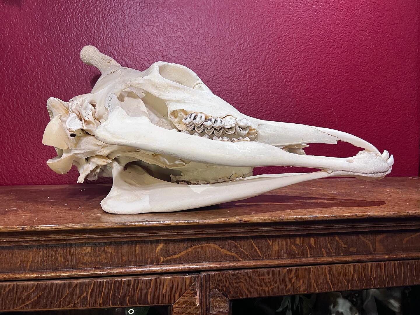The skull measures approximately 28 inches in length, 11 inches in width, and 13 inches in height, reflecting the distinctive elongated proportions characteristic of the species. Importantly, the skull retains all of its teeth, adding to its anatomical completeness and educational significance. Minor imperfections consistent with a B-Grade classification may be present, but they do not detract from the overall integrity or display appeal of the specimen.