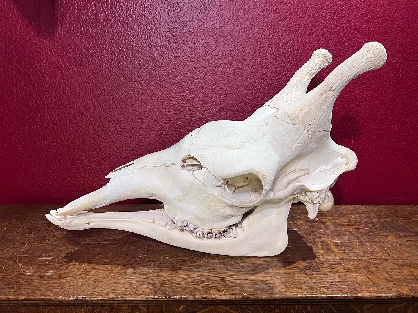 The skull measures approximately 28 inches in length, 11 inches in width, and 13 inches in height, reflecting the distinctive elongated proportions characteristic of the species. Importantly, the skull retains all of its teeth, adding to its anatomical completeness and educational significance. Minor imperfections consistent with a B-Grade classification may be present, but they do not detract from the overall integrity or display appeal of the specimen.
