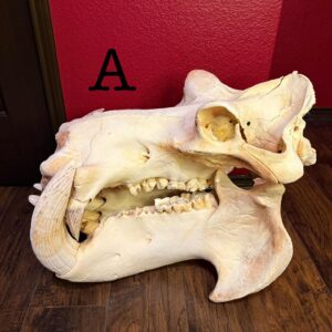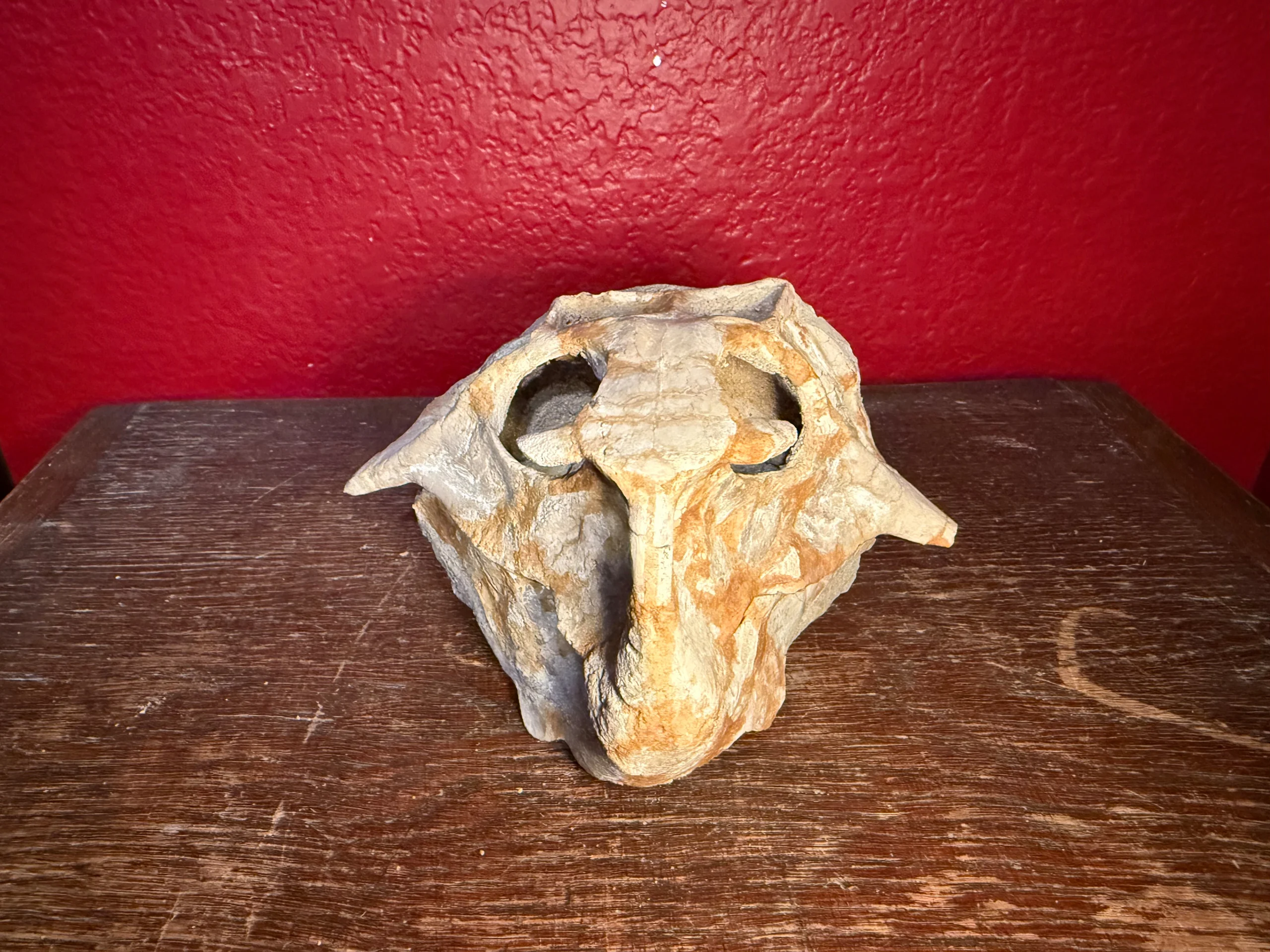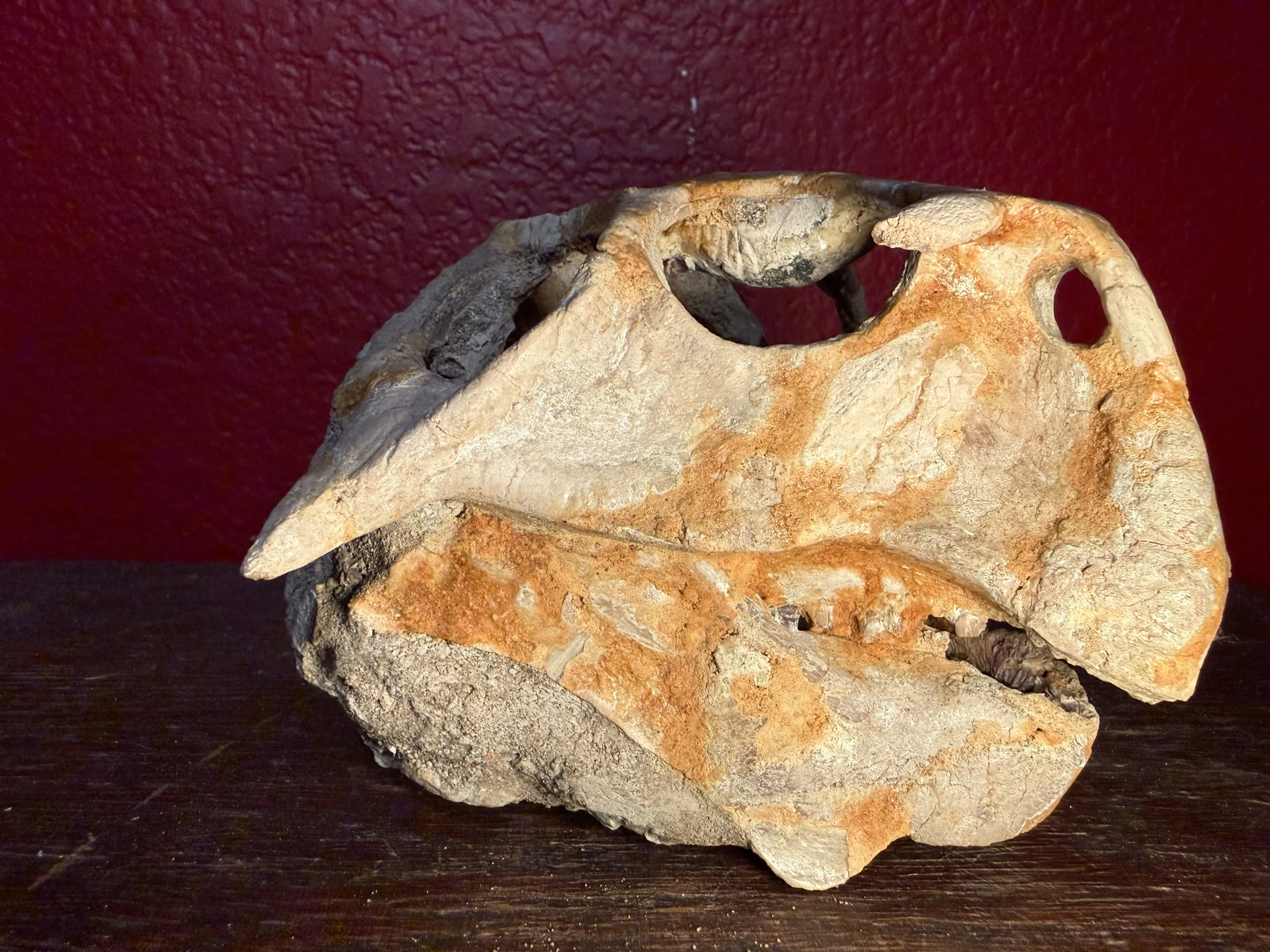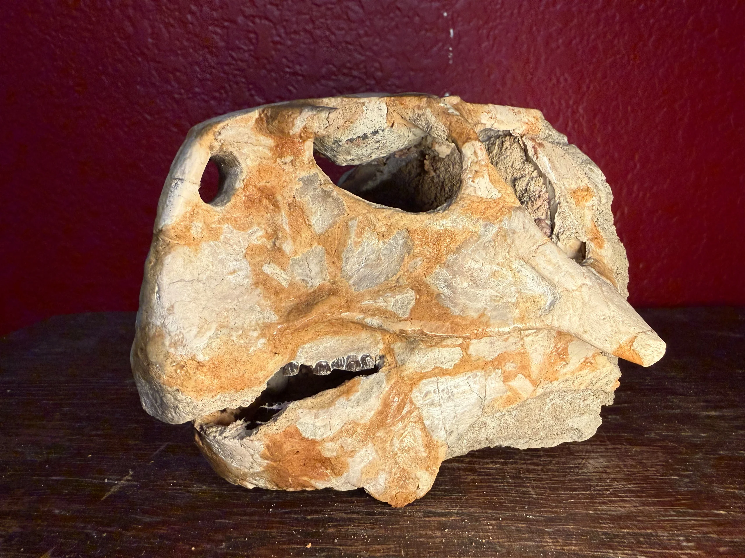 The skull has undergone careful restoration and stabilization, having been rebuilt and structurally reinforced along the back and lower portions using a durable, concrete-type composite. This reinforcement ensures long-term preservation while maintaining the overall anatomical integrity and visual impact of the specimen. The reconstruction work provides essential support without detracting from the fossil’s natural form.