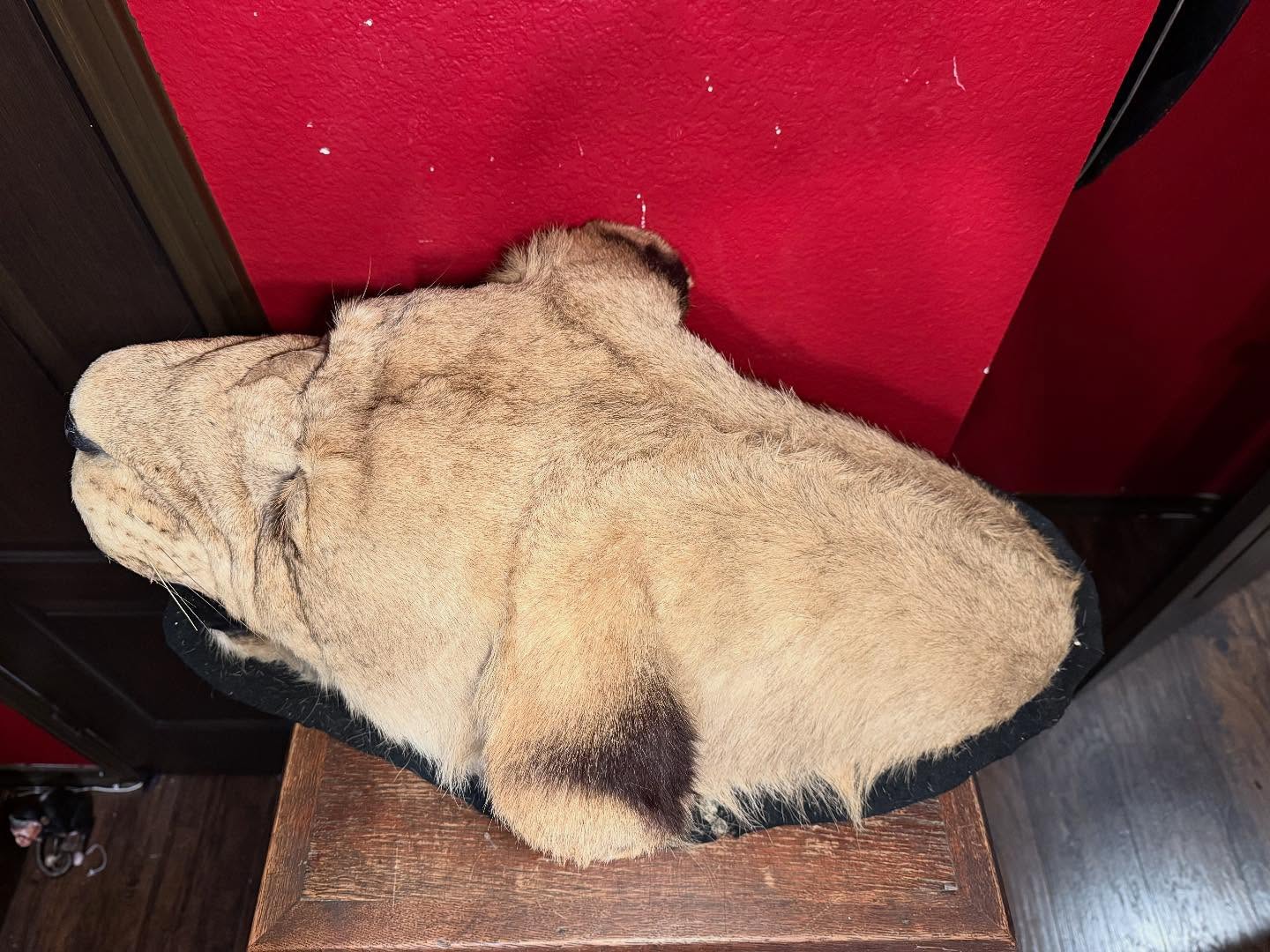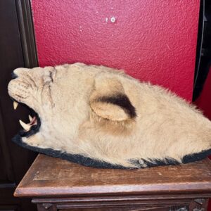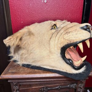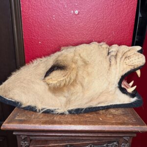 This impressive taxidermy lioness head originates from a vintage lioness rug, carefully repurposed to preserve and showcase the animal’s striking features. With its strong presence and lifelike expression, this is a substantial and commanding piece that reflects both craftsmanship and historical character.