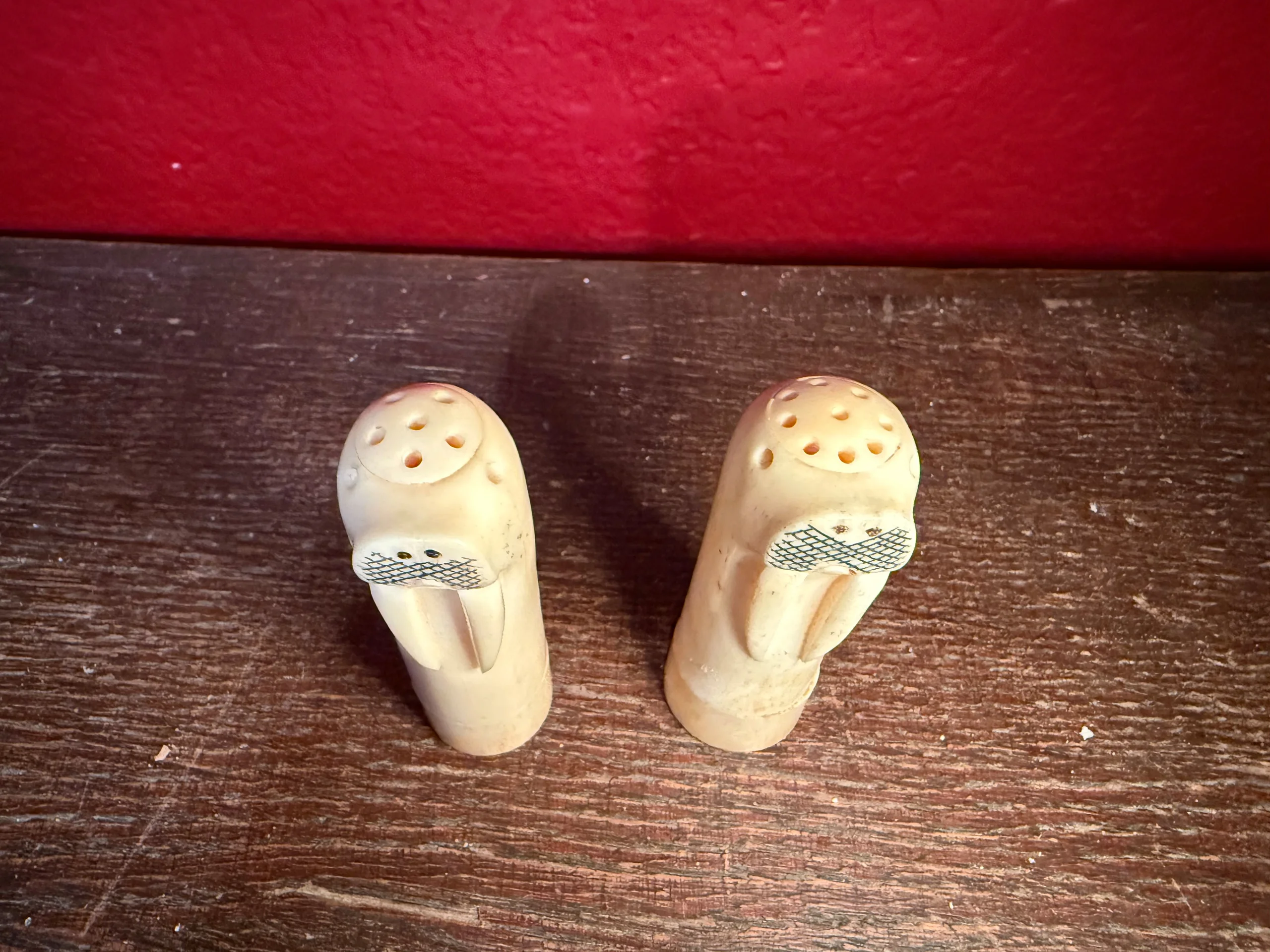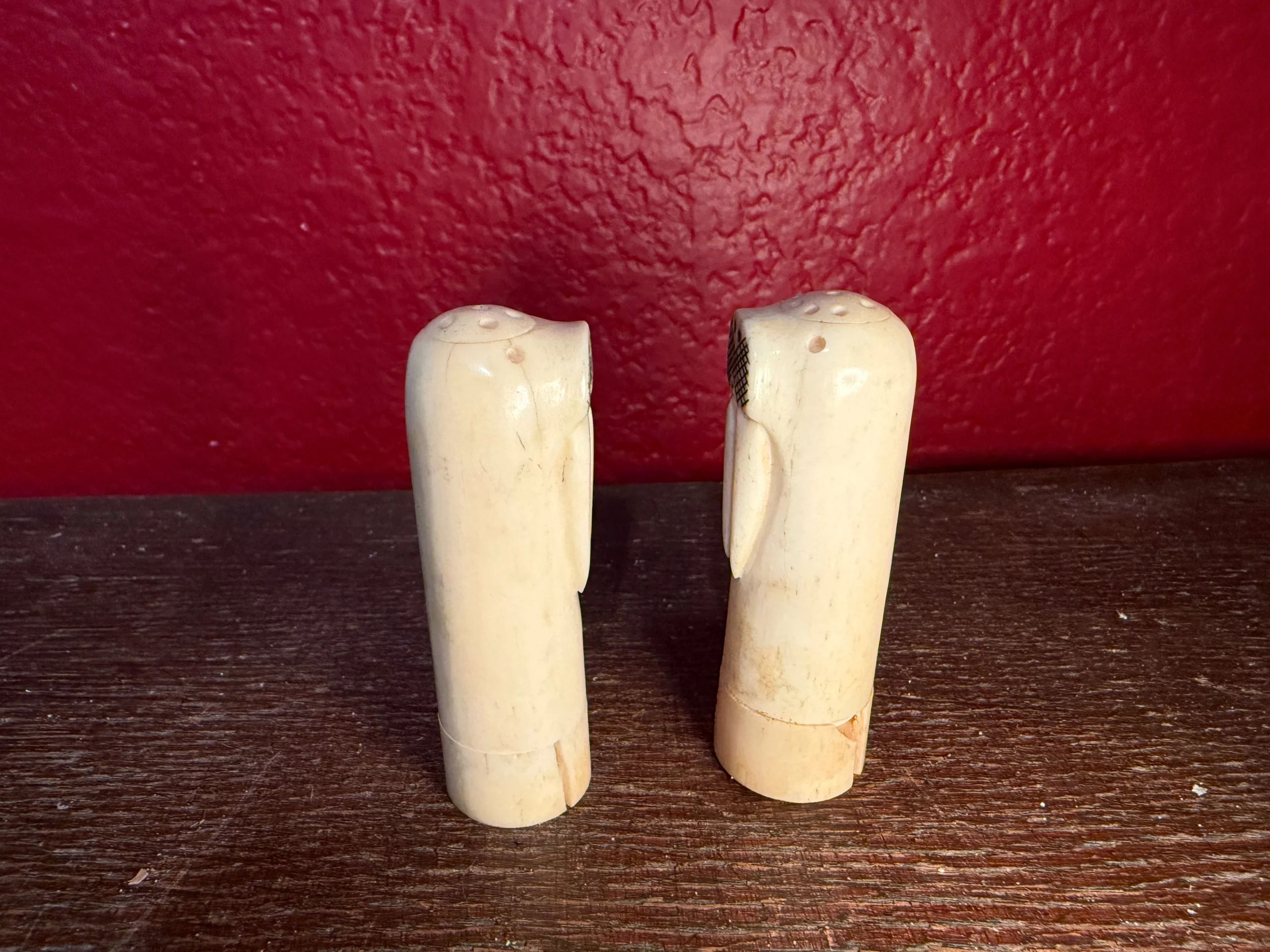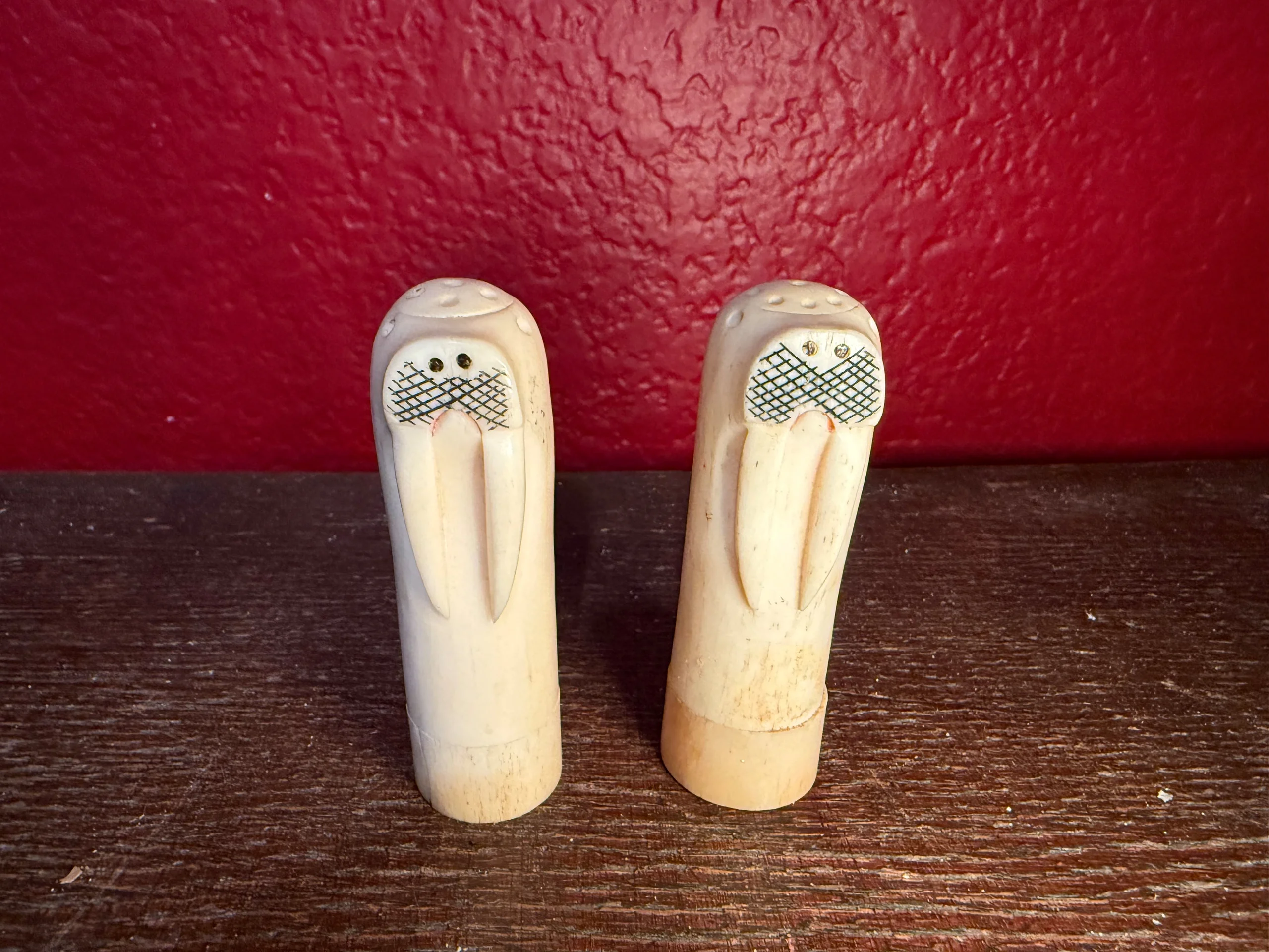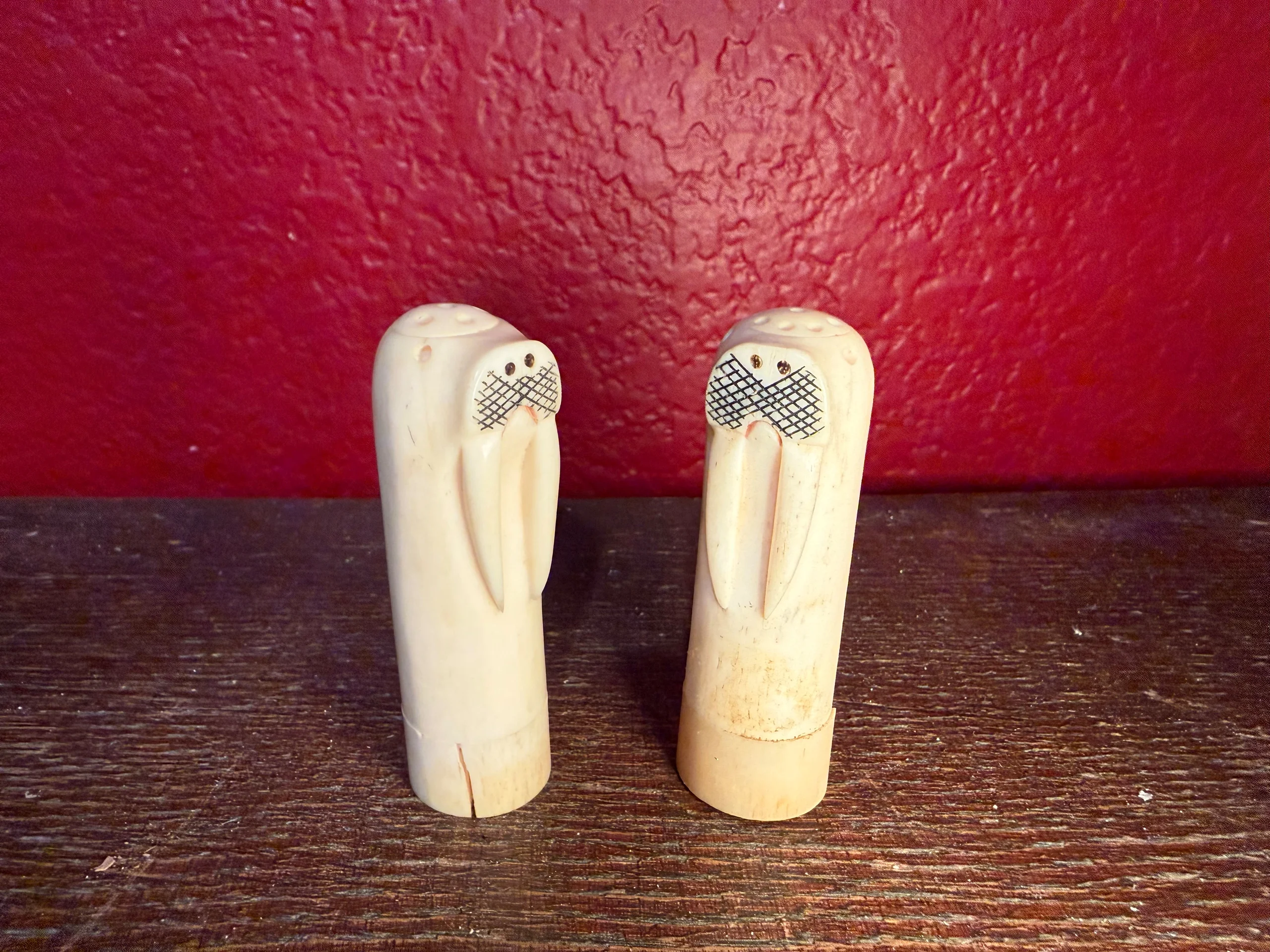 Walrus Salt and pepper shakers made from authentic walrus ivory. The bottoms screw off to fill with salt and pepper (not recommended). One base has a crack and the other has a repaired break. You’ll receive the set.
