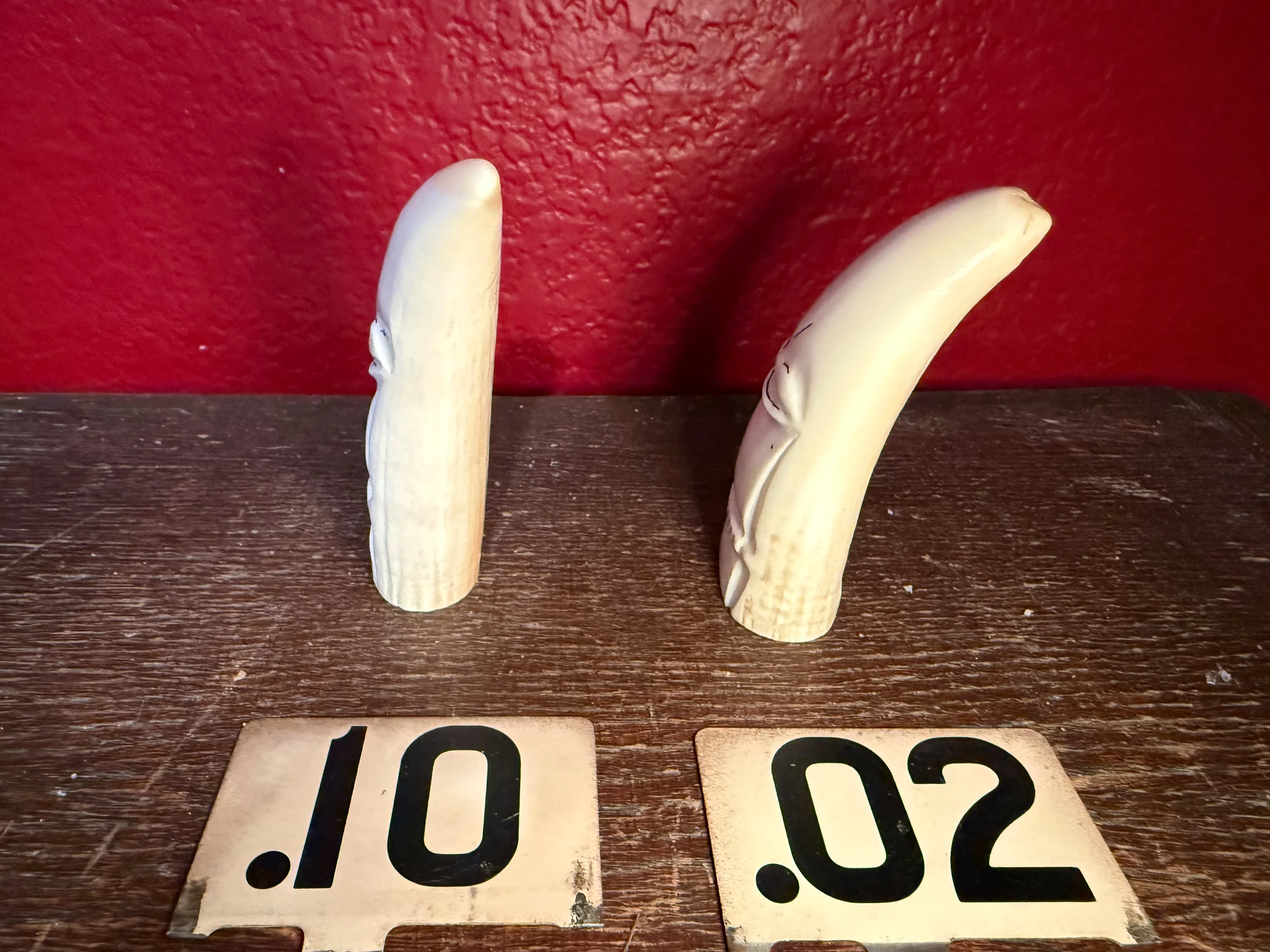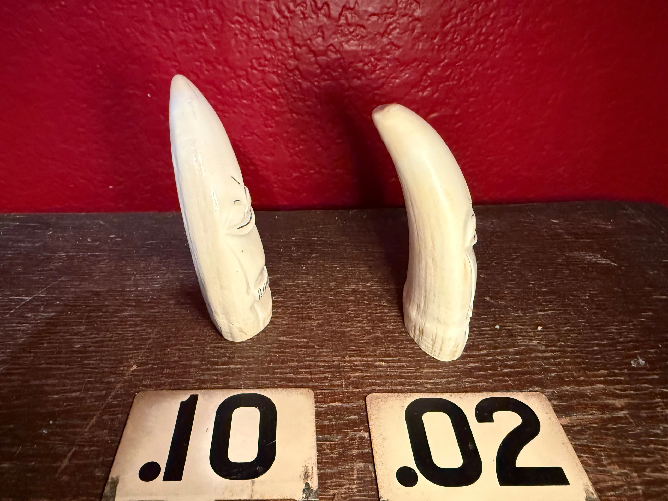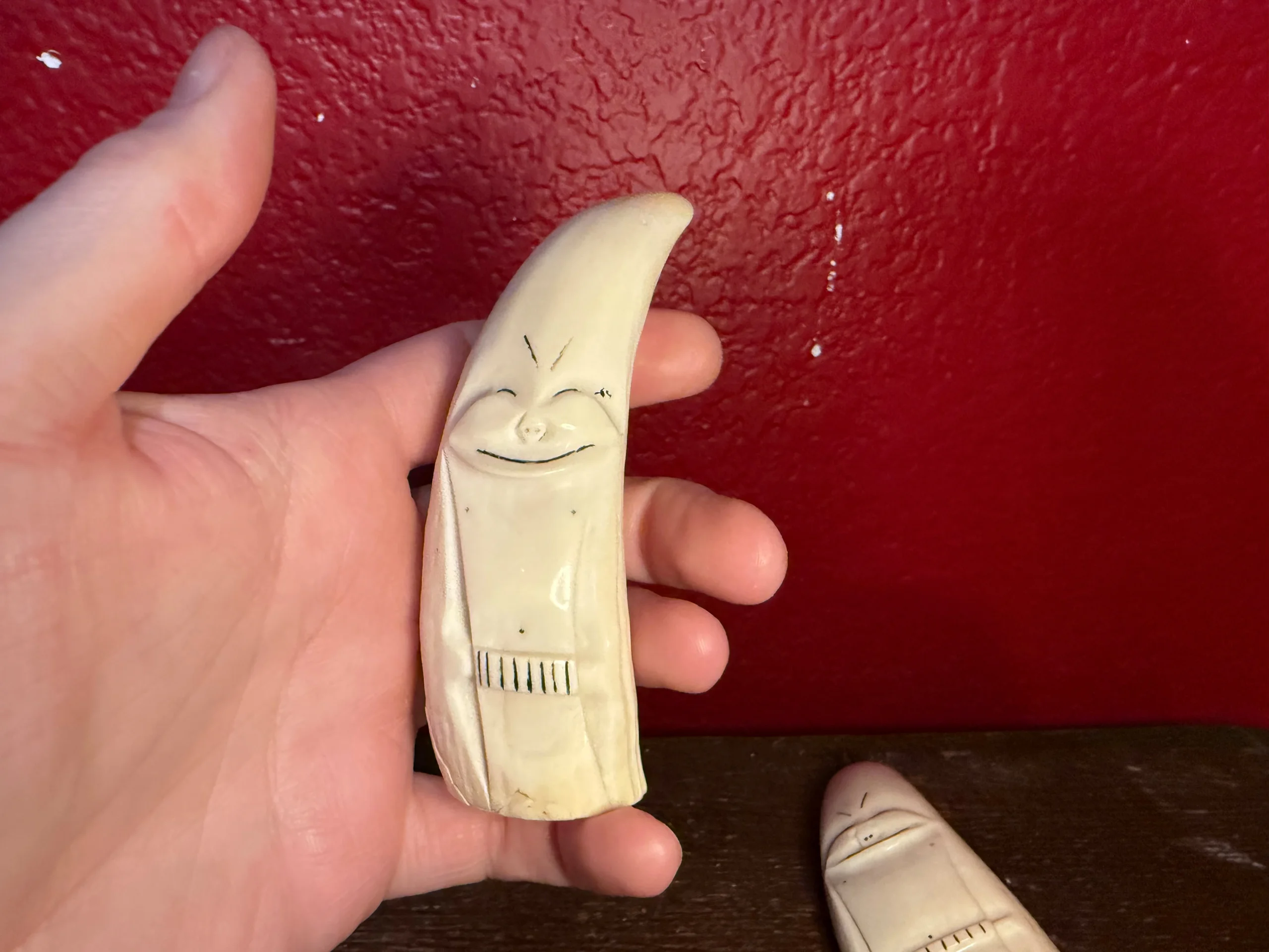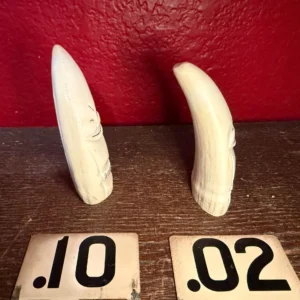 These are sperm whale teeth that have been carved into Billiken figures by inuits. A Billiken is a mythical, impish figure that is designed to bring good luck! Two different sizes and shapes to choose from.